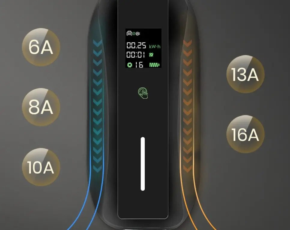 This portable charger with LCD display and 6.5 meters of cable is compatible with all vehicles equipped with a Type 2 socket (Mennekes), allows you to connect to a domestic Schuko socket, and charge your vehicle from 6A to 16A (11kW) or from 6A to 32A (22kW).